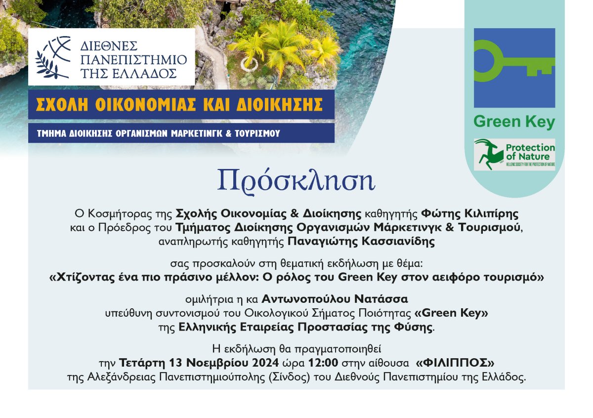 Ο Κοσμήτορας της Σχολής Οικονομίας & Διοίκησης, καθηγητής Φώτης Κιλιπίρης, και ο Πρόεδρος του Τμήματος Διοίκησης Οργανισμών Μάρκετινγκ & Τουρισμού, αναπληρωτής καθηγητής Παναγιώτης Κασσιανίδης, σας προσκαλούν στη θεματική εκδήλωση με θέμα: