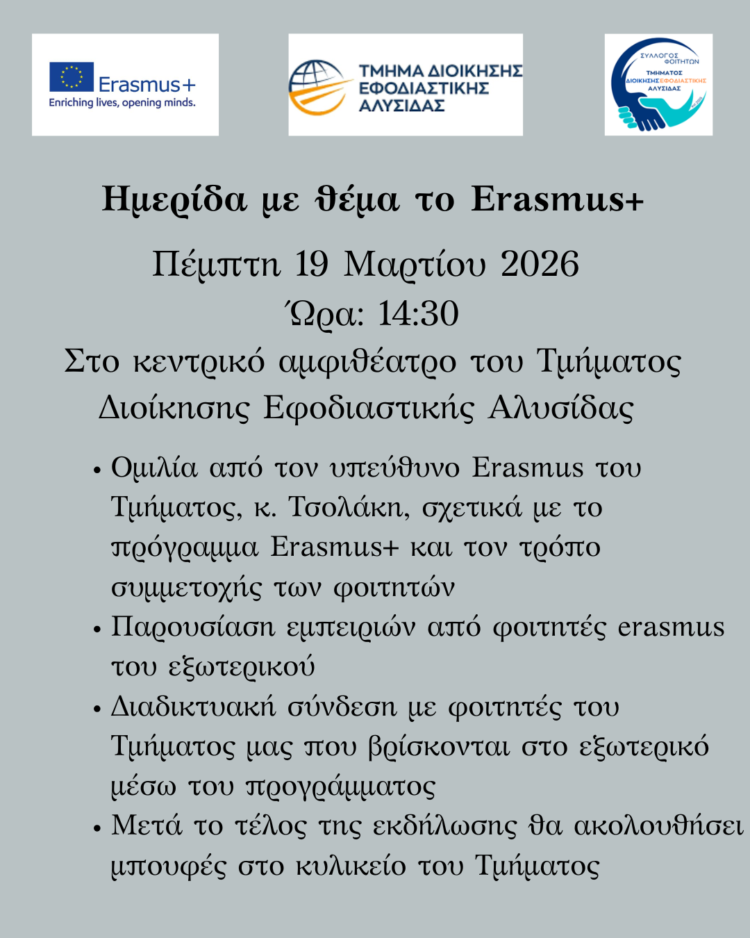 Το Τμήμα Διοίκησης Εφοδιαστικής Αλυσίδας διοργανώνει ημερίδα ενημέρωσης με θέμα το Erasmus+, την Πέμπτη 19 Μαρτίου 2026 and ώρα 14:30, σε αμφιθέατρο του Τμήματος Διοίκησης Εφοδιαστικής Αλυσίδας (Αμφιθέατρο B).